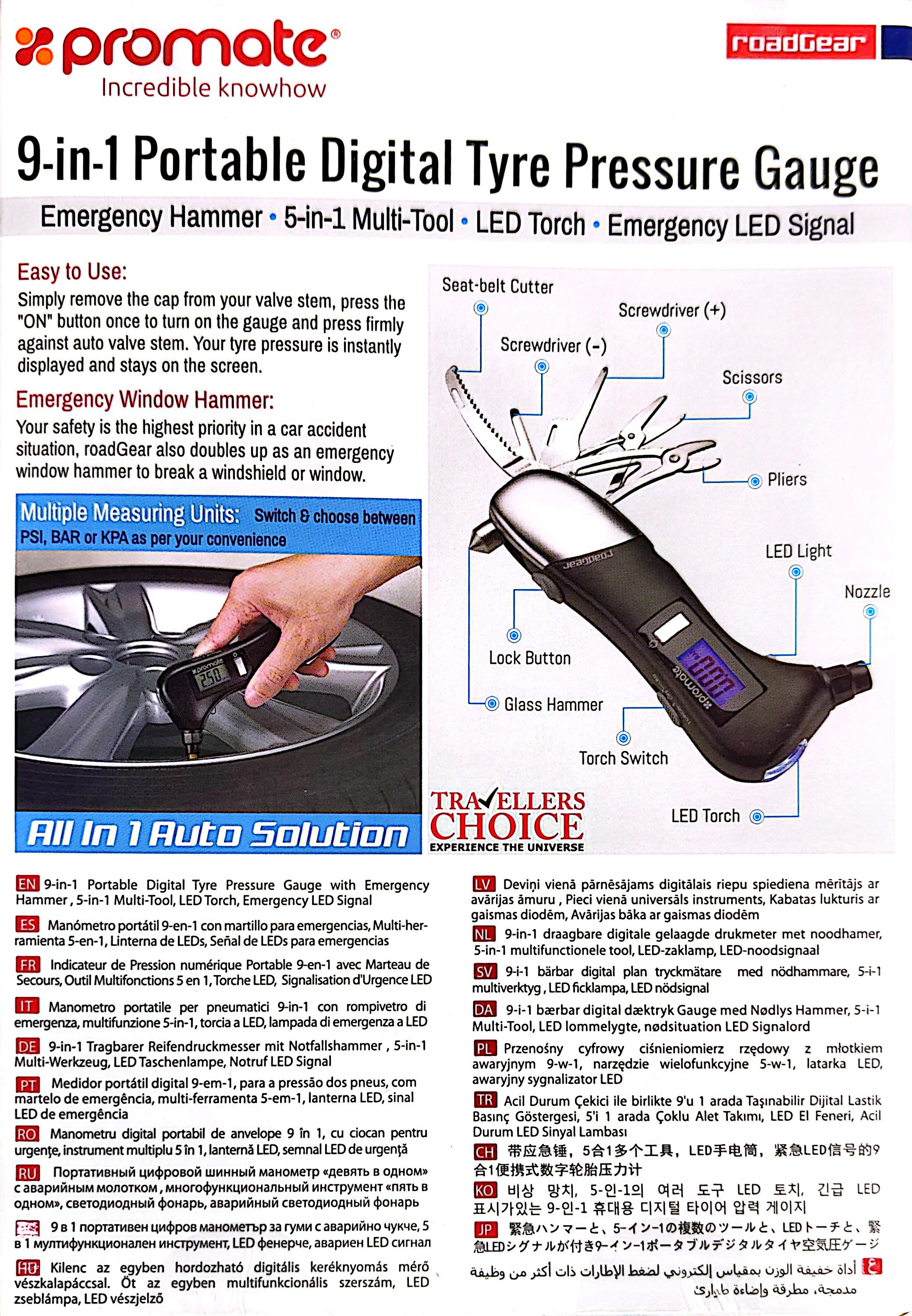 دستگاه سنجش باد و ابزار ۹ کاره تایر اضطراری خودرو- مدل promote 9 in 1 tool kit
